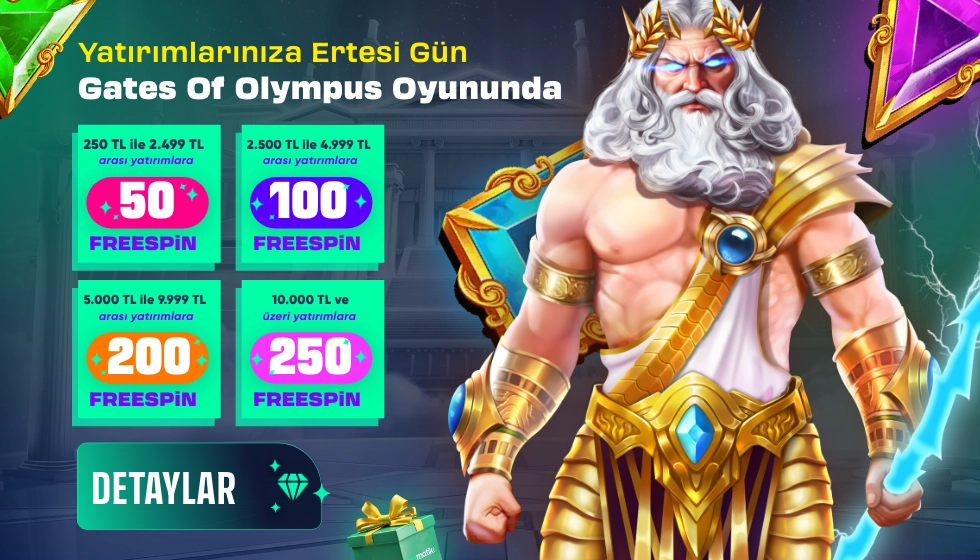 • Haftanın Her Günü yatırım işlemi gerçekleştirmiş üyelerimize ertesi gün Gates Of Olympus oyununda freespin eklenecektir. • 250 TL ile 2.499 TL arası yatırımlara 50 Freespin • 2.500 TL ile 4.999 TL arası yatırımlara 100 Freespin • 5.000 TL ile 9.999 TL arası yatırımlara 200 Freespin • 10.000 TL ve üzeri yatırımlara 250 Freespin • Freespin eklendikten sonra Telegram Kanalımızdan duyuru yapılacaktır. • Bu kampanyada eklenen freespinler ile elde edilen kazançlardan minimum - maksimum 500 TL çekim yapabilirsiniz. • Yatırım Bonuslarından yararlanmanız yada çekim işlemi gerçekleştirmeniz bu promosyondan yararlanmanıza engel değildir. • Bakiyeniz varken freespin eklemesi sağlanmış ise son yatırımınız kuralları baz alınacaktır.